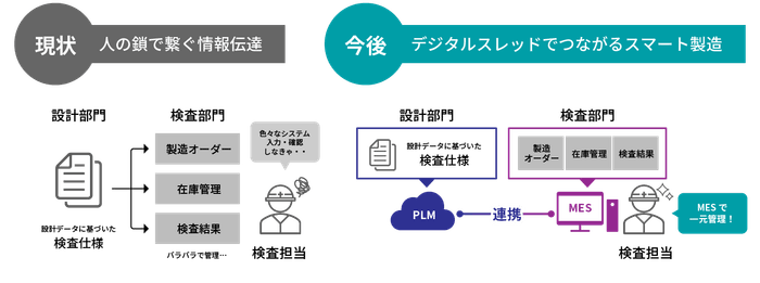 以上3点のさらなる体制強化をすべく、要求仕様と検査仕様を統一したデータモデルで管理できる PLM(Teamcenter X)システムと(Teamcenter X)、リアルタイムな製造プロセス管理ができるMES(Opcenter)を導入することとしました。