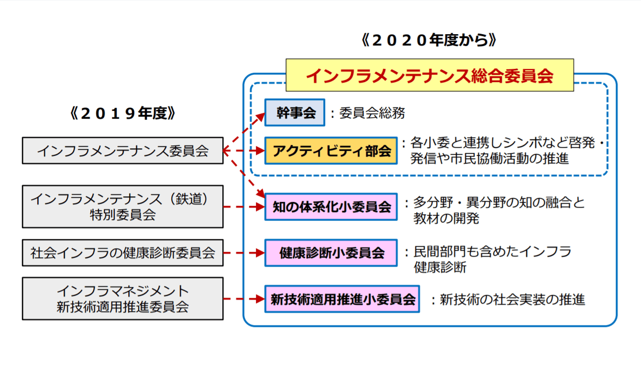 インフラメンテナンス総合委員会は、それまで個別に活動していたメンテナンス関連の委員会を統合し、体系的かつ有機的に活動することを目的として2020年度に発足した委員会です。笹子トンネル天井板落下事故に端を発したインフラの老朽化問題や、近年頻発している豪雨災害・地震災害に対するメンテナンスの重要性に鑑み、委員長は時の会長があたり、2023年度は田中 茂義が務めました。