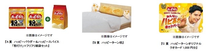 キャンペーン期間中、「ハッピーターン」シリーズ対象商品を合計200円(税込)以上購入し、WEBまたはハガキから応募いただいた方の中から抽選で、『ハッピーターン』の“粉だけ”やハッピーターン枕など合計1,500名様に賞品をプレゼントします。