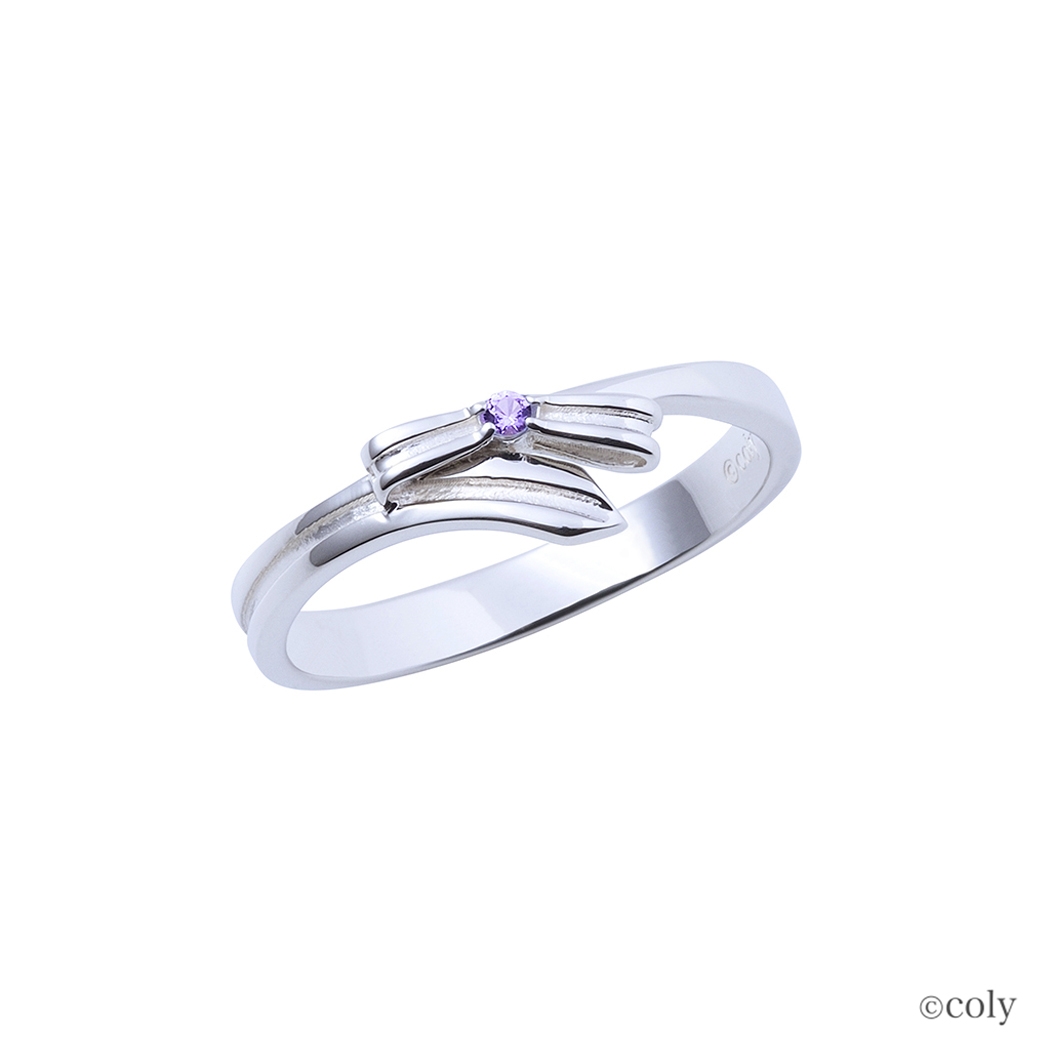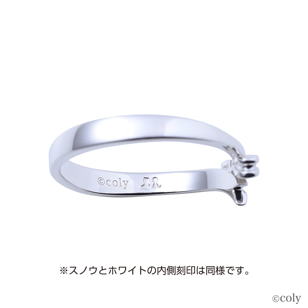 「魔法使いの約束」に登場する北の国の魔法使い、スノウをイメージしたシルバーリングです。衣装のリボンをモチーフとしてリングに取り込んだV字タイプのデザインに、イメージカラーストーンをセット。内側には魔道具のアイコンを刻印しました。ホワイトのリングとお揃いのデザインです。