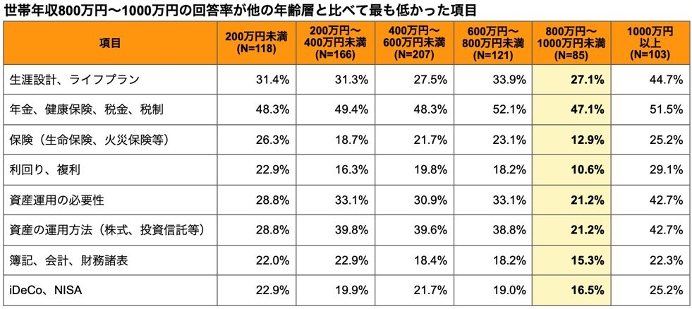 世帯年収1000万円以上の人が、1000万円未満の人よりも金融教育への関心が高いことが分かりましたが、世帯年収に比例して関心が高まるのかというと、そうではないようです。世帯年収が800万〜1000万円では、他のどんな年収層よりも関心が下がる項目が多数ありました。