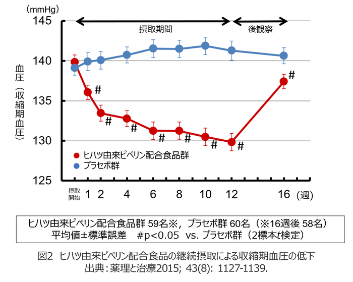 ② ヒハツ由来ピペリンを配合した食品を用いた臨床試験を行い、血圧が高めの方の血圧を下げる機能を確認しました。