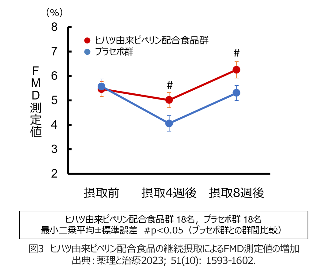 その結果、ヒハツ由来ピペリン配合食品を摂取した群では、プラセボ食品を摂取した群に比べFMD値が有意に高い値を示しました(図3)。FMD値が高いほど、血管が柔らかいことを意味します。