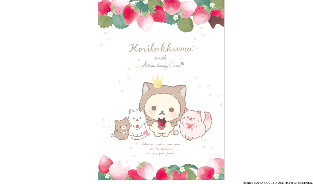 そして、2021年、今年も「コリラックマストア」を有楽町マルイに開店いたします。メインアートは、大好きないちごと、あま~い香りがする3匹のねこに囲まれたコリラックマを中心に描かれたとてもかわいいデザインになっています。それぞれのねこたちの格好をしたコリラックマにも注目です。