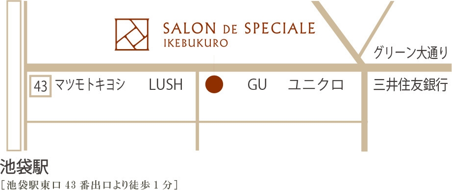 池袋駅東口より徒歩1分。駅前のグリーン大通りに面し、非常に利便性の高い立地です。美意識が高く最高のおもてなしを求めるお客さまとの出会いの場として展開してまいります。