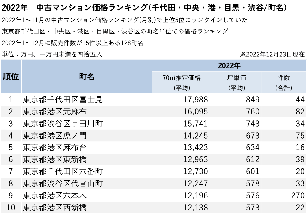 ※町名ランキングは、東京都千代田区・中央区・港区・目黒区・渋谷区の5区内で、2022年1~12月の販売物件数が15件以上ある128町名を対象に作成。