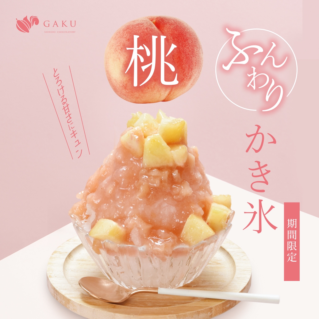 信州ショコラトリーGAKUが贈るふわふわ桃かき氷は、契約農家さんから仕入れた安曇野産の桃の果肉をたっぷりと使用しています。※