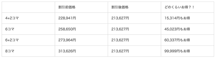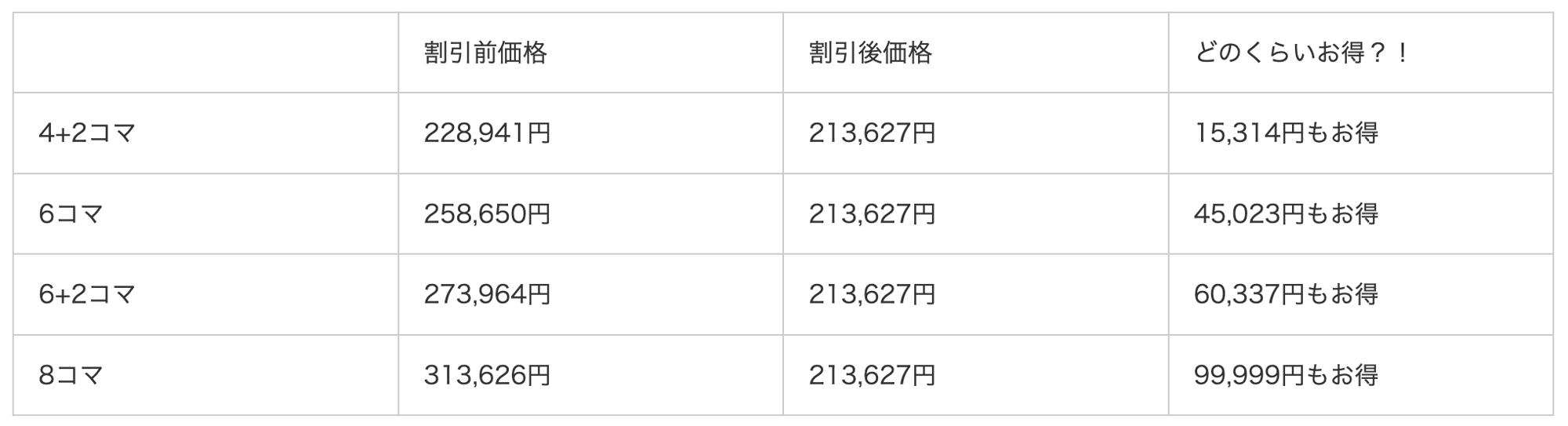 ※通常はコマ数に応じて料金が上がりますが、本キャンペーンでは最大8コマまで追加しても「4コマの料金」でご利用いただけます。