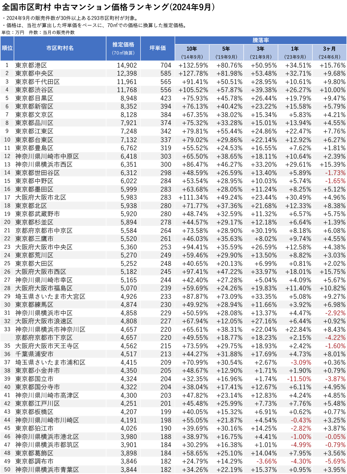 全国市区町村 中古マンション騰落率ランキング(2024年9月_3・5・10年前比較)