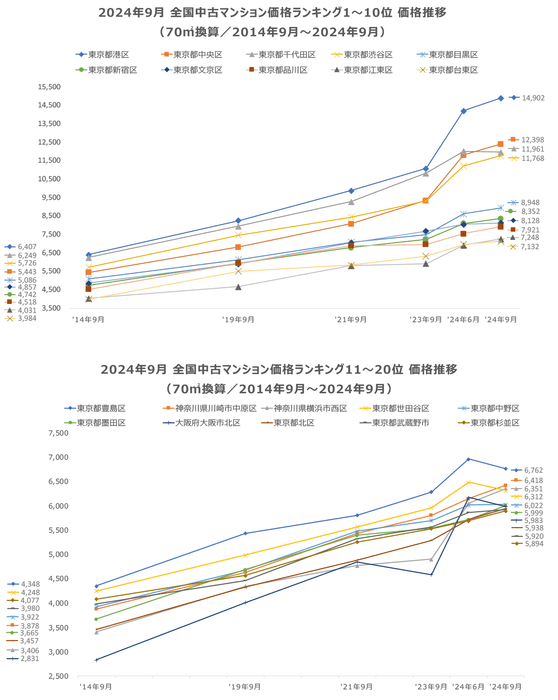 「不動産×WEB×ビッグデータ」の領域で、さまざまな不動産テックサービスを展開する株式会社ワンノブア カインド(本社:東京都港区、代表取締役社長:川島 直也、以下当社)は、当社が運営するマンション情報サイト 「マンションレビュー」の保有データを元に、2024年9月の全国市区町村における中古マンションの相場を 調査。坪単価をベースに70m²の価格に換算した「中古マンション価格」*1 と価格ランキング上位20件について 過去10年間の価格推移、および1年前からの価格上昇率を表す「騰落率」のランキングを発表いたします。