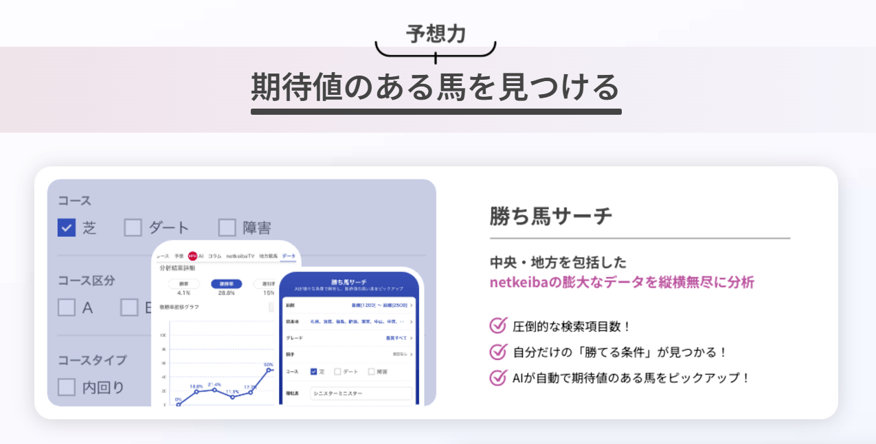 中央競馬だけでなく地方競馬も含めた膨大なデータから、自分だけの”勝てる条件”を探すことのできる「勝ち馬サーチ」や、映像解析により出走全馬のラップタイムを高精度に計測した「個別ラップ」データなど、これまでにない新たな予想ファクターを提供することで、他人が気付いていない期待値の高い馬を見つけるサポートを実現します。