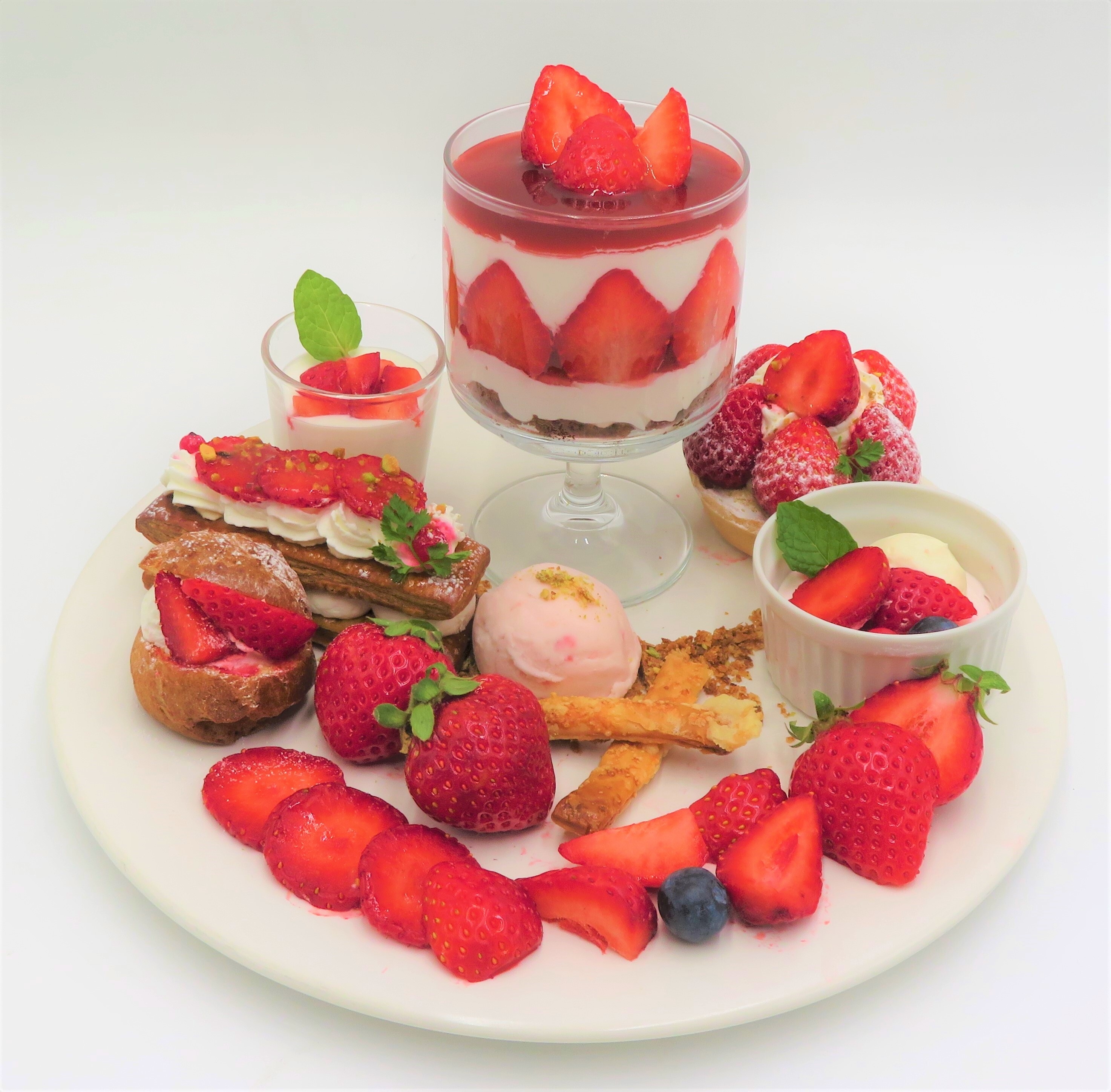 昨年ご好評いただきましたミルフィーユやタルトに加え、今年はいちごムースやプチシュー、バージョンアップしたパフェもお楽しみいただけます。旬のいちごをたっぷりと様々なスイーツでお楽しみいただけるお得なプレートです。