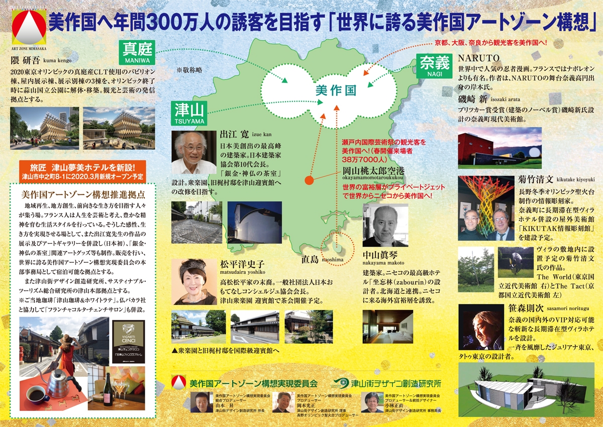 2021年隈 研吾氏が、岡山県真庭産の集積材(CLT)を使用した建物の真庭市移築により、真庭アートギャラリーが設立予定。建築界のノーベル賞=プリツカー賞を受賞した磯崎 新氏設計の奈義町現代美術館とあわせ、津山に、日本美を世界に発信できうる日本美最高峰の建築家出江 寛先生(第10代日本建築家協会会長)による徳川家の迎賓館であった衆楽園や旧梶村邸を、津山の都市格をあげるべく、赤坂迎賓館や京都迎賓館に次ぐ、地方初の国内外のVIP対応可能な津山迎賓館とし、衆楽園を日本4大名庭園として世界へ発信。さらに奈義町に情報彫刻家 菊竹 清文氏の屋外彫刻美術館を併設する建築家笹森 則次氏設計による長期滞在型ヴィラホテルの建設を目指す。実現できれば、作州・美作国一帯が、直島の安藤 忠雄、妹島 和世氏(真庭市出身)に勝るとも劣らない、世界最先端のアートゾーンとなりえる。美作国は、1,300年以上の歴史を有し、奈義町高円は菅原道真直系子孫が住みつき、浄土宗の開祖法然上人初学の地であり、世界で最も読まれている忍者漫画「NARUTO」の作者の出身地でもある。当地で体験可能な「サステイナブル・ツーリズム=自然にやさしい持続可能な観光活動」は世界からの観光客を呼び込める日本有数の地域となりえる可能性を秘める。そして、津山は美作国の首都であり、珈琲、瓦斯、水素等の言葉を生み出した洋学発祥の地として古くより世界と直結した街であり、歴史と文化的資産の宝庫である。さらに作州一帯の景色は、まさしく欧米人が憧れる日本の原風景であり、本物の日本の美を世界に発信できる魅力の他である。この構想を、真庭、鏡野、奈義町、隣接鳥取県の智頭町等と連携して実現を目指し、観光客年間300万人の誘致を目指す。
