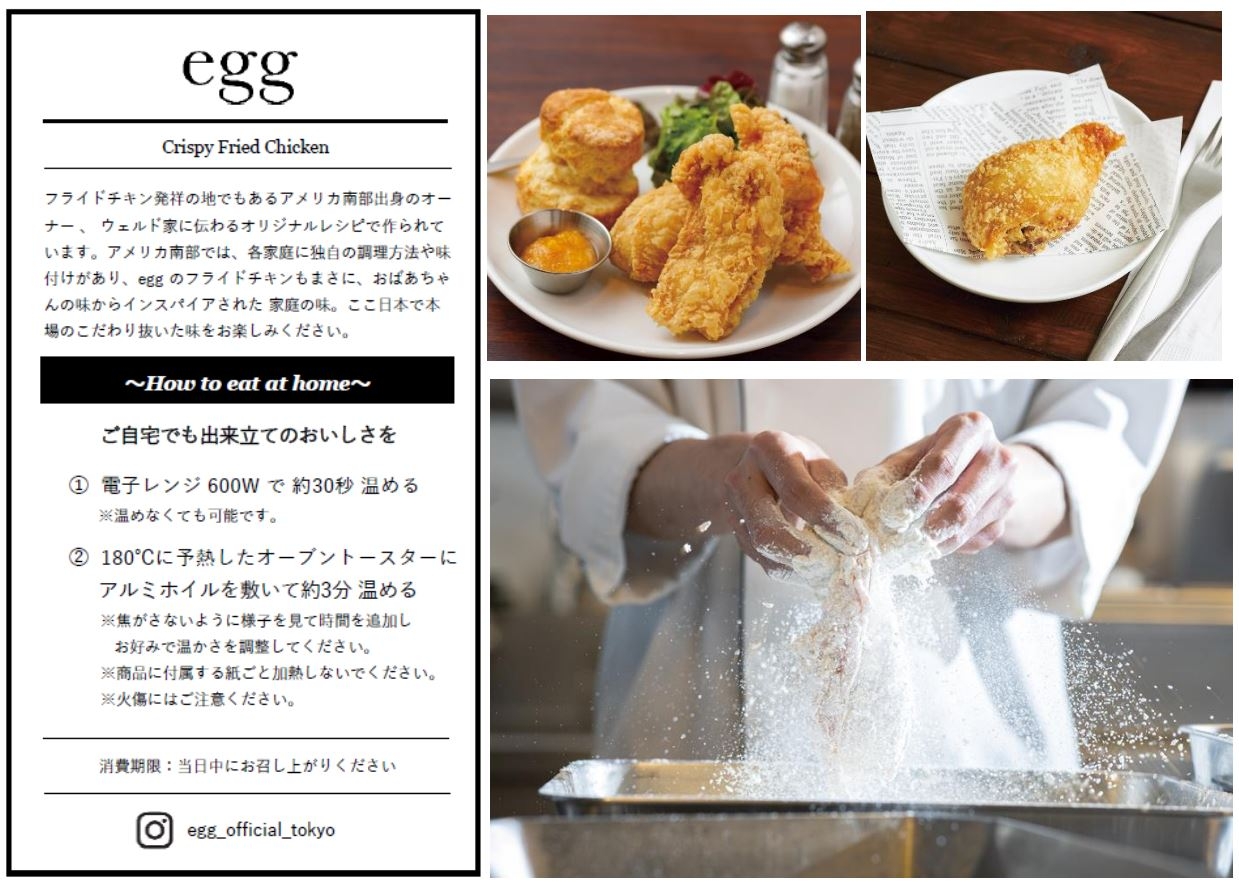 週末のおうち時間やホームパーティーなど、クリスマスを楽しむのに欠かせないチキン!egg で提供するフライドチキンは、フライドチキン発祥の地でもあるアメリカ南部出身のオーナー、ウェルド家に伝わるオリジナルレシピで作られています。アメリカ南部では、各家庭に独自の調理方法や味付けがあり、egg のフライドチキンもまさに、おばあちゃんの味からインスパイアされた家庭の味。ここ日本では、こだわりの飼料から生まれる「風味」をもつ「ふもと赤鶏」を使用し、赤鶏らしい、きめ細かな肉質と旨味のある鶏肉を egg のオリジナル配合スパイスで調理することで、噛んだ瞬間からジューシーで柔らかく、スパイスの香りが染み込んだフライドチキンです。