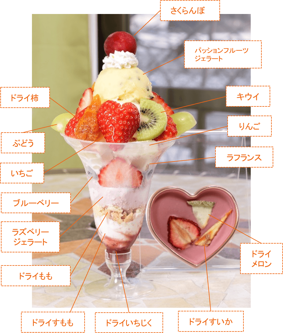 山形県で栽培された15種類のフルーツが、生果・冷凍・ドライ・ジェラートと様々な形で楽しめる、「やまがたフルーツ」の魅力を詰め込んだパフェ。添加物不使用のフルーツジェラート入り。