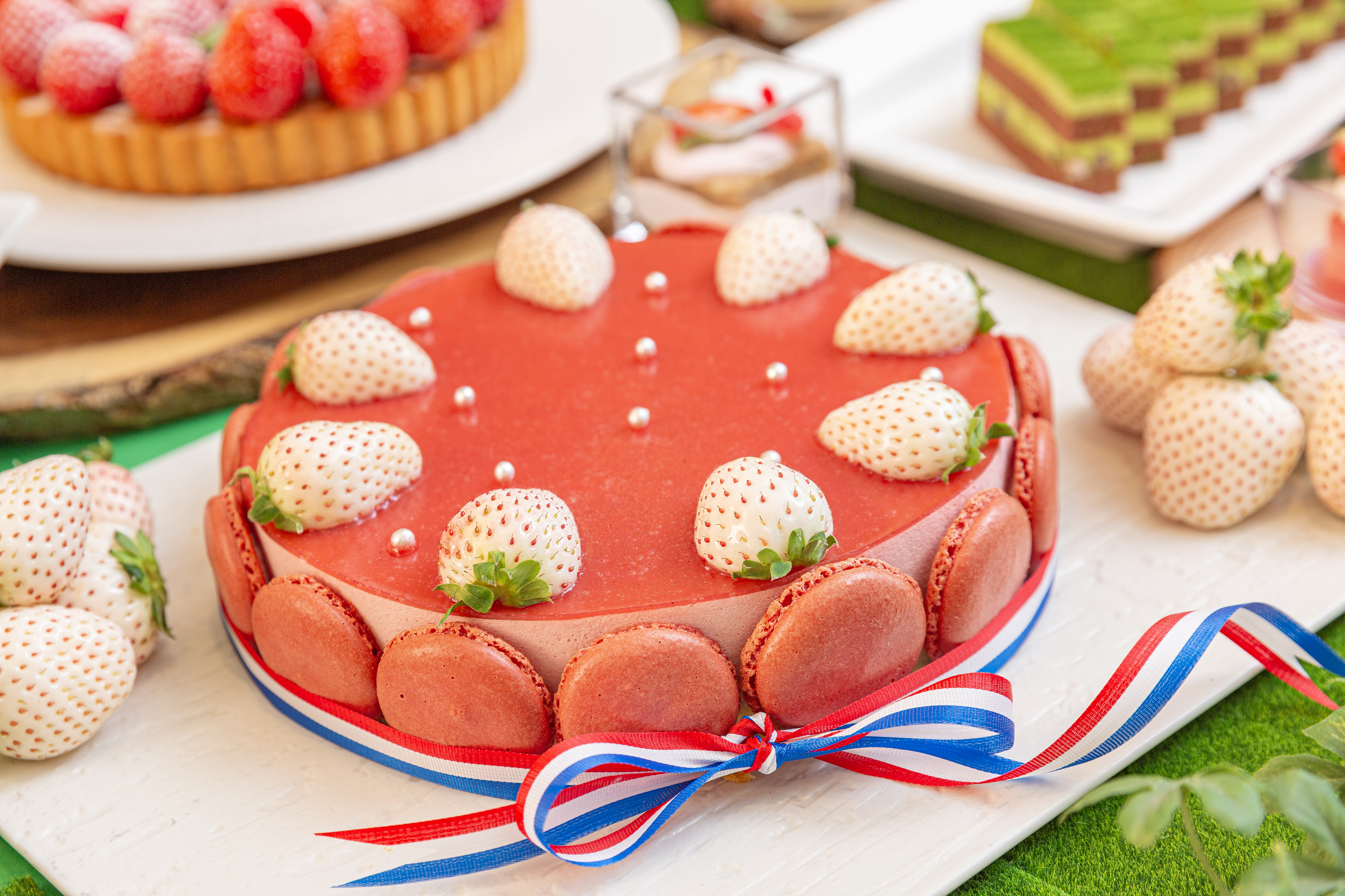 今年は、いちご、抹茶を使った20種以上のスイーツで、春のガーデンをイメージした色鮮やかなメニューをご用意しました。ビュッフェスタイルでお好きなだけお楽しみいただけます。また滋賀県の農園から直接届く“紅ほっぺ”、“章姫”、“ベリーポップすず”、“よつぼし”そして白い果皮の“天使のいちご”の5種類から1種をウェルカムスイーツとして通常サイズの約2倍の大きな苺をジュレにのせてお一人さま一皿ずつご提供いたします。