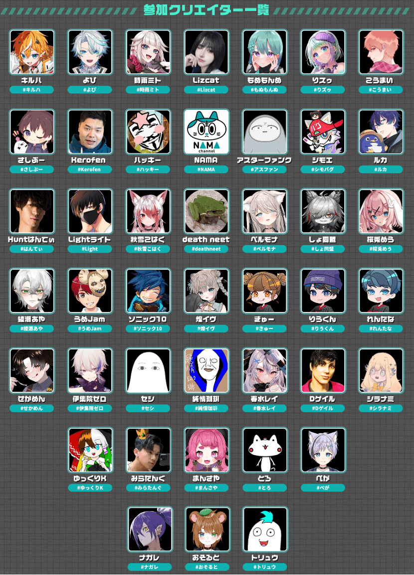 ナガレ/NAMA/ハッキー/Huntはんてぃ/ぺが/ベルモナ/まんさや/