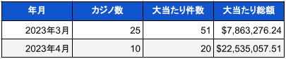 2023年4月米国カジノにおけるジャックポット当選件数と総額