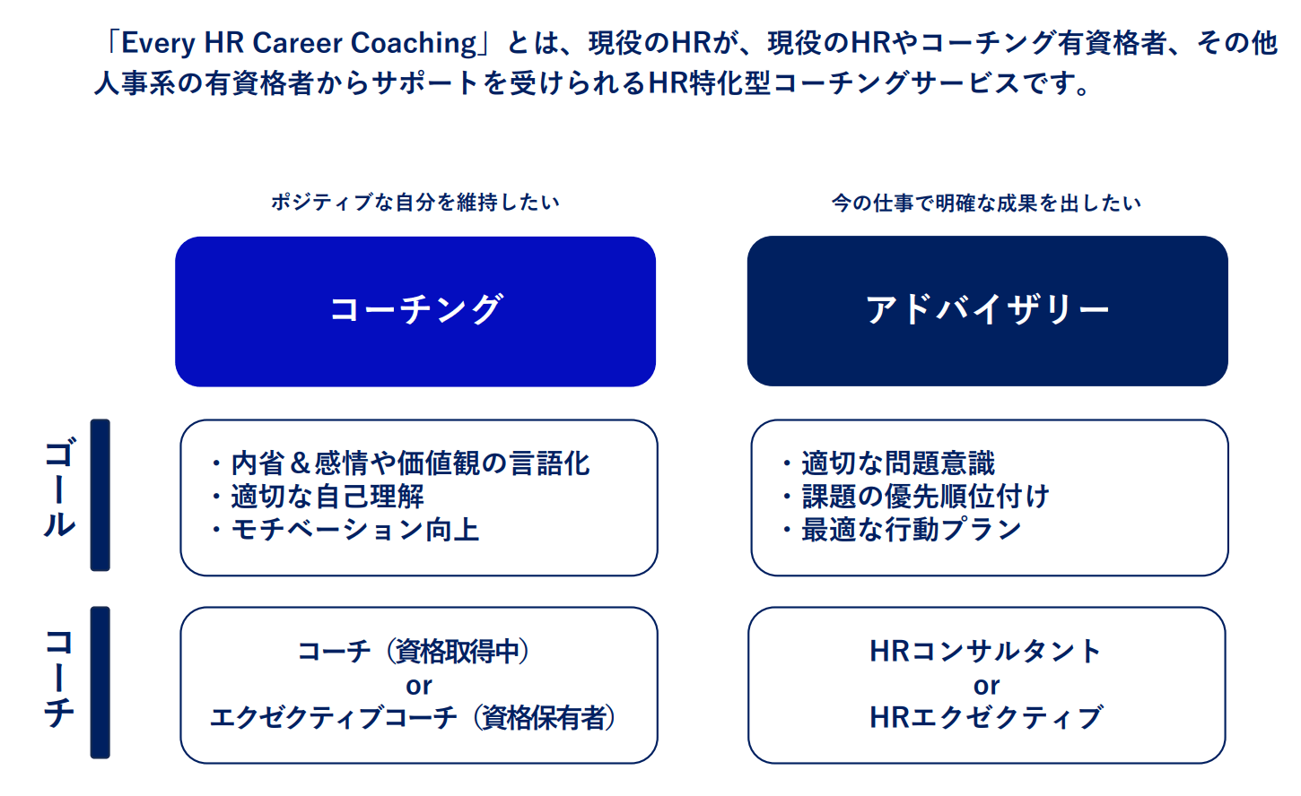 「Every HR Career Coaching」は、現役のHRが、現役のHRやコーチング有資格者、その他人事系の有資格者からサポートを受けられるHR特化型コーチング・アドバイザリーサービスです。内省を促進しもやもやを解消するコーチング、より実践的なサポートを受けることが出来るアドバイザリーの2種類からコーチを選ぶことができます。