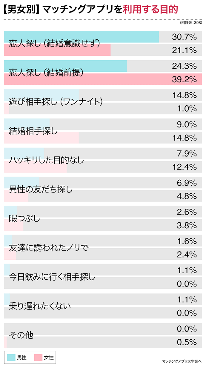 マッチングアプリを利用する目的を男女別でみると、若干の違いがうかがえました。