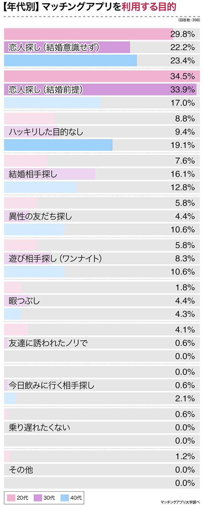 そこで、マッチングアプリ大学ではマッチングアプリを利用中・または利用経験のある20~40代の男女398人に、マッチングアプリを使った理由や選んだポイント、使ってみて一番良かったアプリなどについてアンケート調査を行いました。