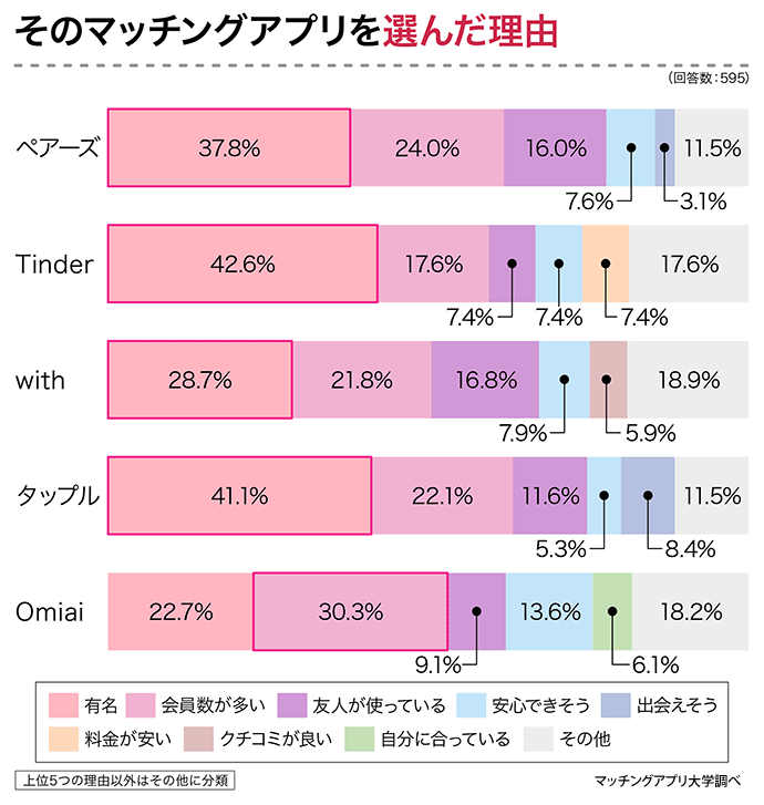 利用されているマッチングアプリは、ペアーズ・Tinder・タップル・Omiai・withの5強