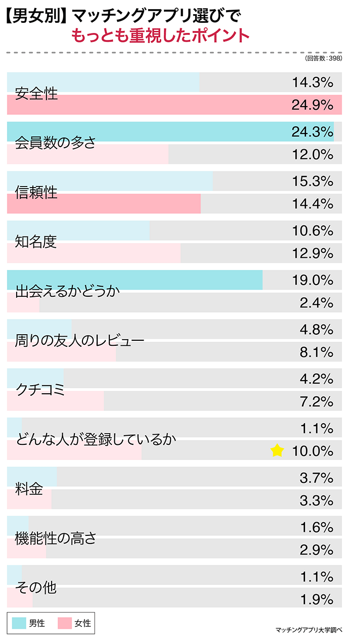 女性の1位は「安全性」(24.9%)、2位は「信頼性」(14.4%)、3位は「知名度」(12.9%)と、女性は安心して利用できる環境かどうかを重視しているのに対し、男性の1位は「会員数の多さ」(24.3%)、2位は「出会えるかどうか」(19.0%)と、男性は出会いの実現可能性を重視する結果となりました。