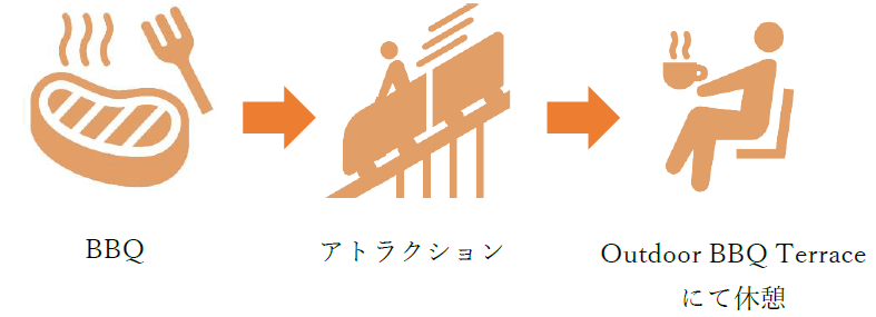 BBQ後に園内アトラクションに乗車、その後再度Outdoor BBQ Terraceに戻って休憩することが出来ます。