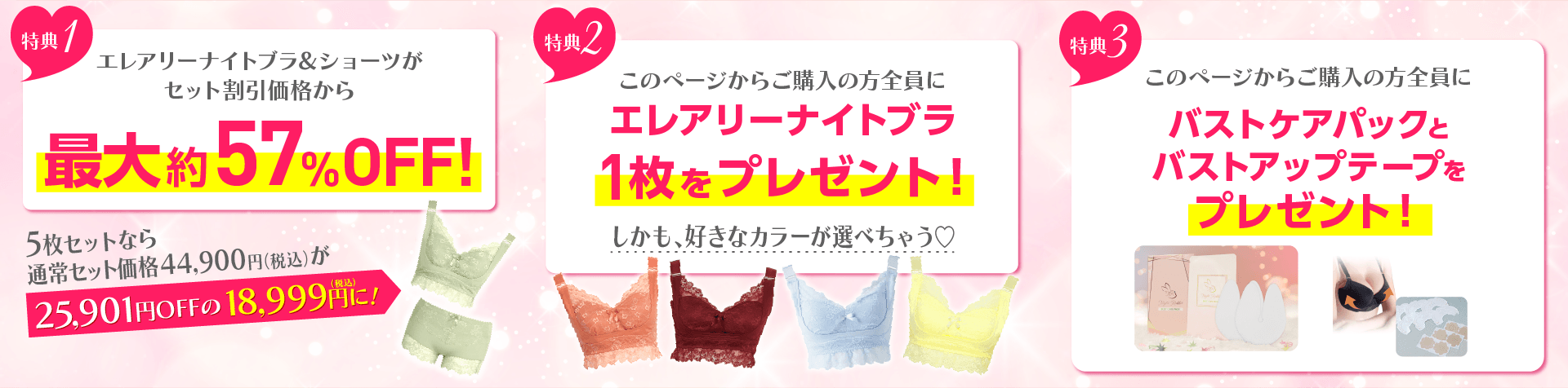 開催中の「いいおっぱいの日」キャンペーンは、エレアリーナイトブラ&ショーツのセットが最大57%オフとなり、3枚~5枚セット購入で半額以上おトクになる、どこよりもおトクなキャンペーンです。そのほか、キャンペーン中にセットでご購入いただいた方には「エレアリーナイトブラ」を1枚プレゼント。また、バストケアパック(ナイトラビット)とバストアップテープもプレゼントする3大特典を用意しました。