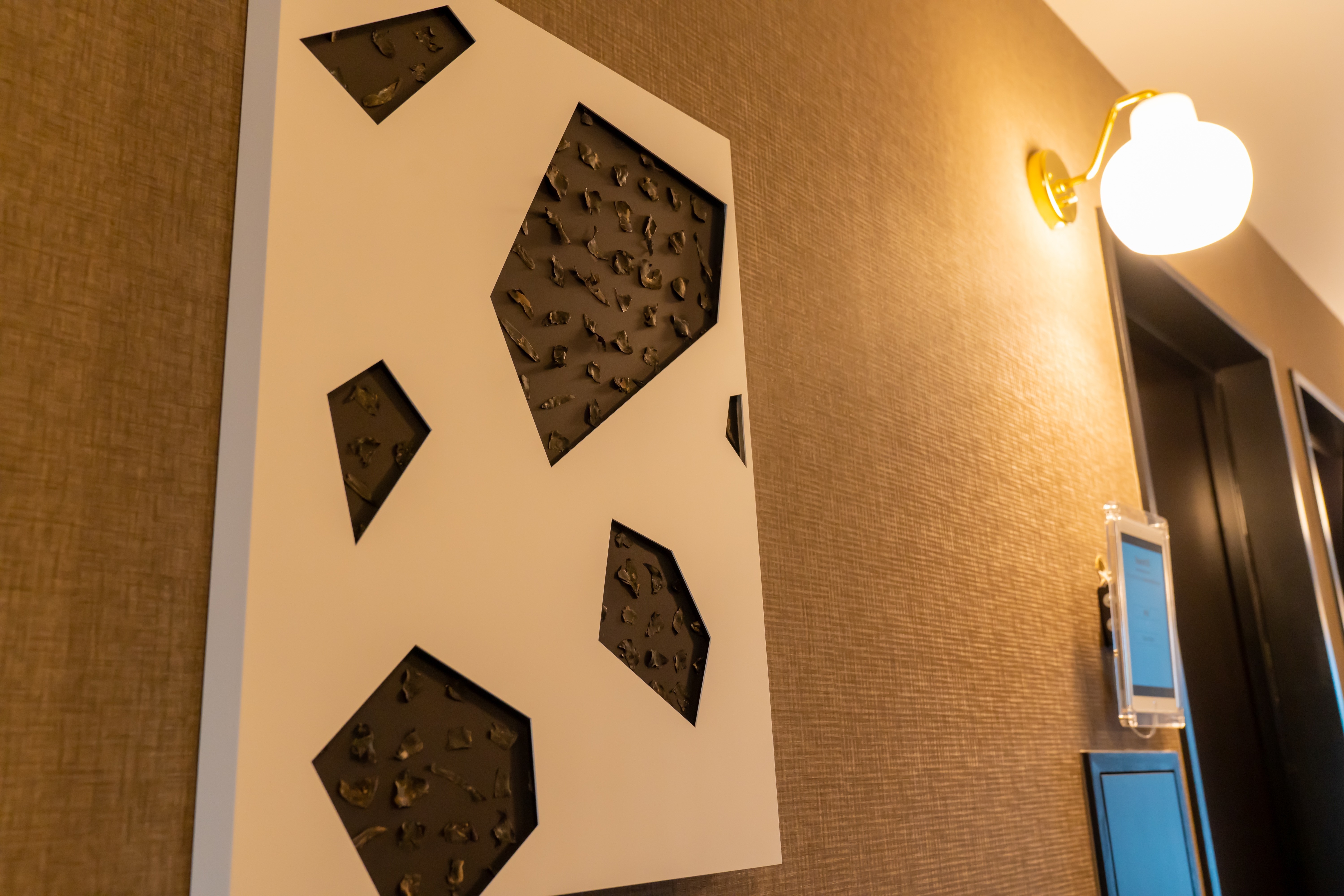 客室前の廊下には地元企業の協力のもとで集めた、羊の毛や牛の爪など上士幌町らしい廃材を活かしたアートを展示します。また合わせてロビーラウンジにはアートが出来上がるまでの過程をまとめたムービーを上映。ホテルにいながら町の取り組みを知るきっかけをつくり、その後の旅程をつくる手助けをします。作品のフレームにはこの地ならではの要素としてデフォルメしたウシ柄を取り入れています。
