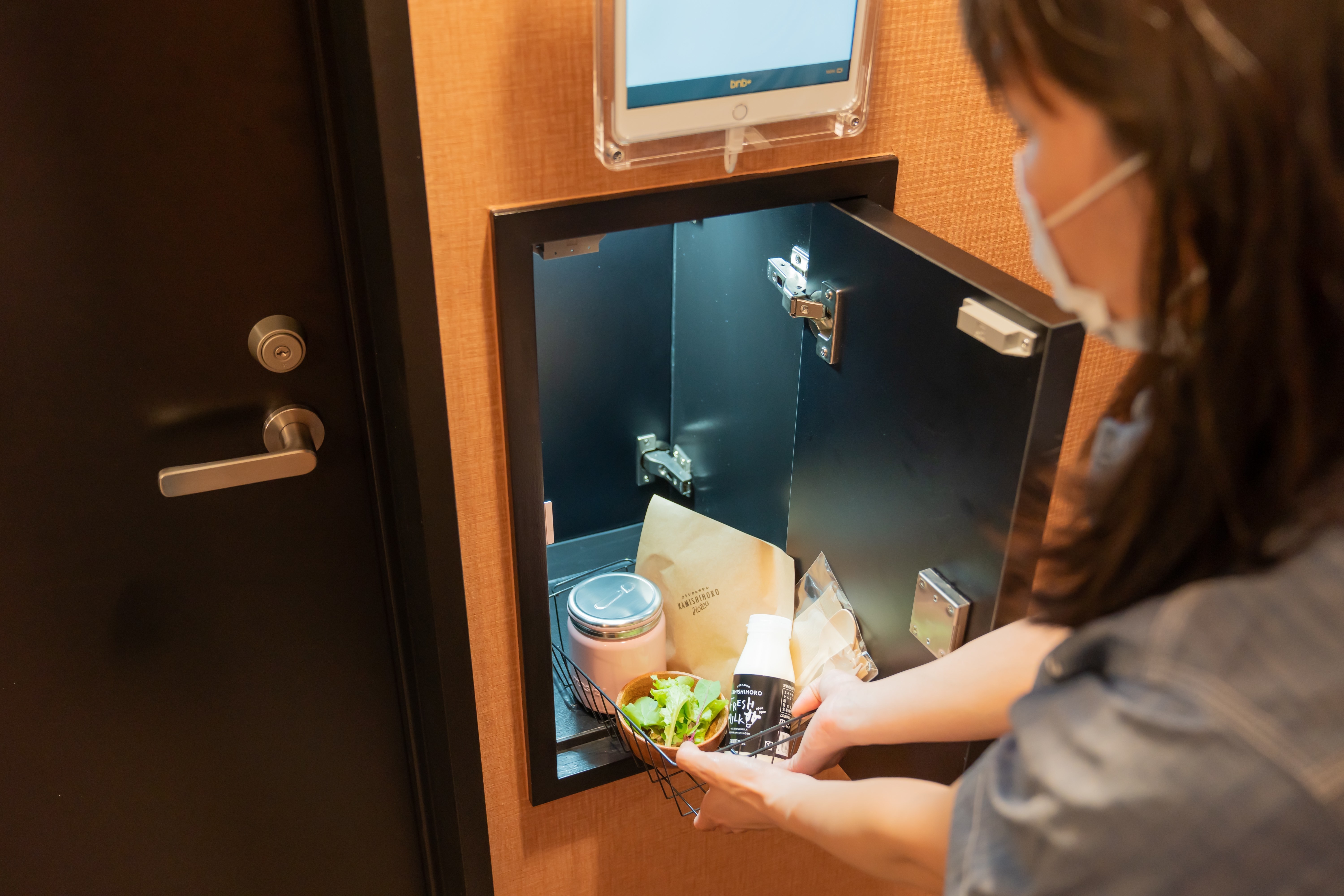 フロントからのお届け物を非対面で受け取れるデリバリーボックスを全客室に完備します。ボックスにお届け物が入ると、センサーが感知して客室内のランプが点灯し、到着完了のお知らせをする仕組みです。