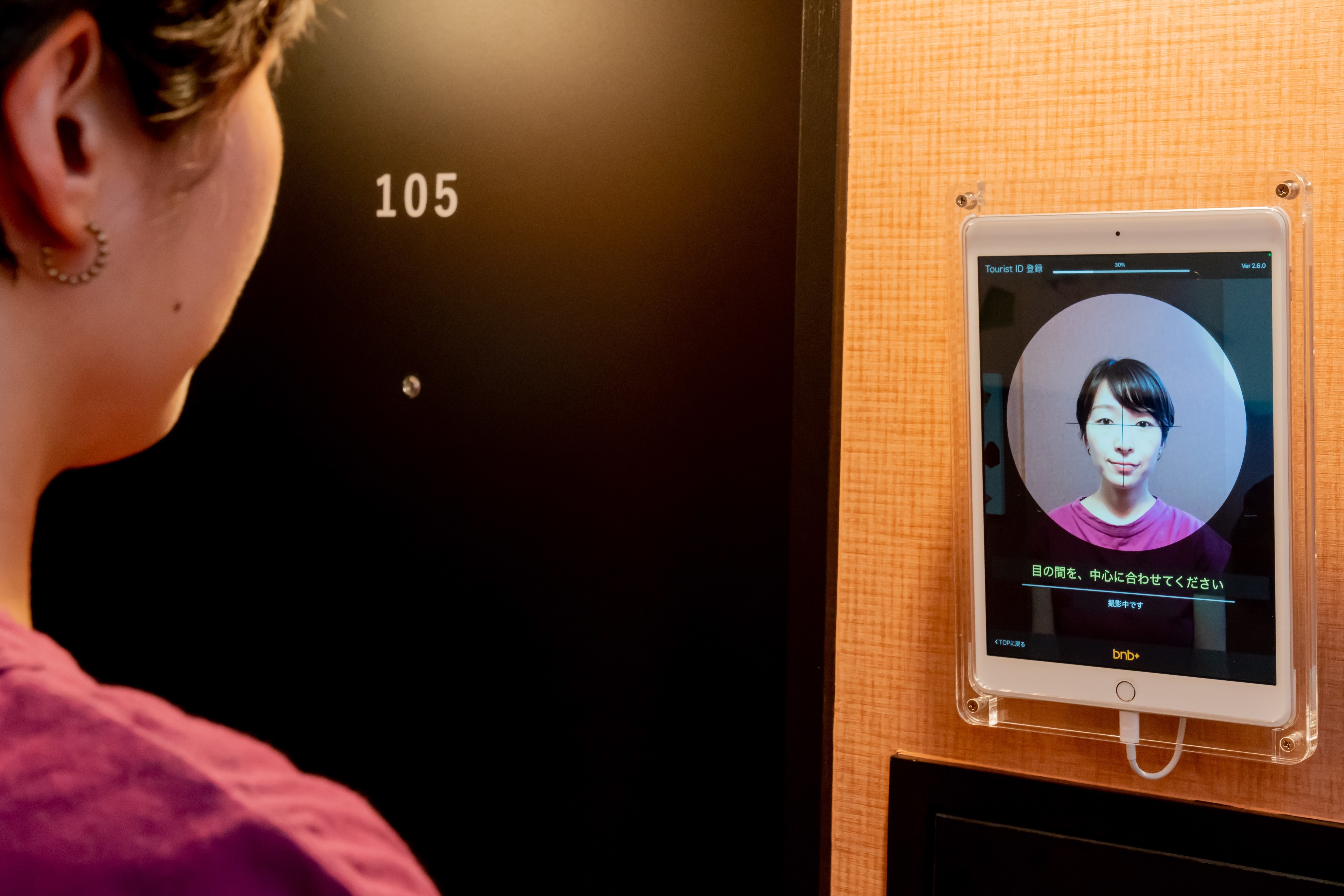 客室の入室時は顔認証システムを採用します。入り口にあるモニターを正面から見るだけで入室が可能です。チェックイン時に一度顔登録すれば追加の作業はありません。従来のようにカギを忘れて入れなくなったり、両手が荷物で塞がっていたりしても慌てることなくスマートな入室を叶えます。