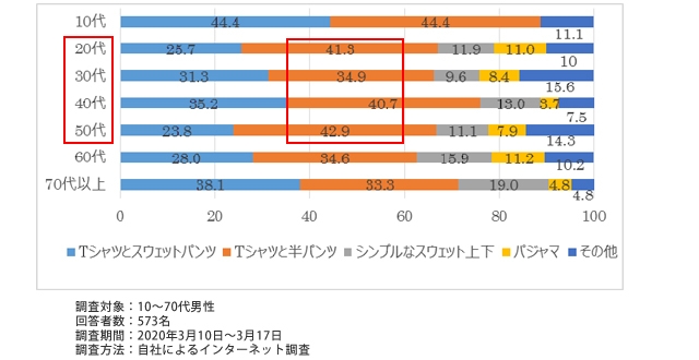 20~50代男性の春夏おうちスタイルの約40%が 「Tシャツ+半パンツ」