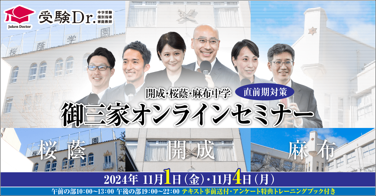 株式会社日本教育指導総合研究所JET(所在地:東京都新宿区、代表取締役社長:屋口 京子)が運営する中学受験専門の個別指導塾・家庭教師派遣の受験Dr.は、「開成・桜蔭・麻布中学 直前期対策 御三家オンラインセミナー」を、2024年11月1日(金)・4日(月)に開催します。