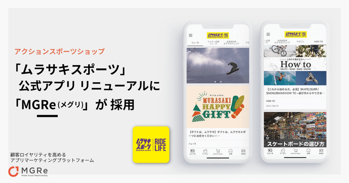 株式会社ランチェスターが提供するアプリの企画・開発から運用までワンストップでマーケティングを支援するアプリマーケティングプラットフォーム「MGRe(メグリ)」がアクションスポーツ用品の企画・輸入・販売を手がける「ムラサキスポーツ」の公式アプリ リニューアルにおいて、採用されましたことをお知らせします。