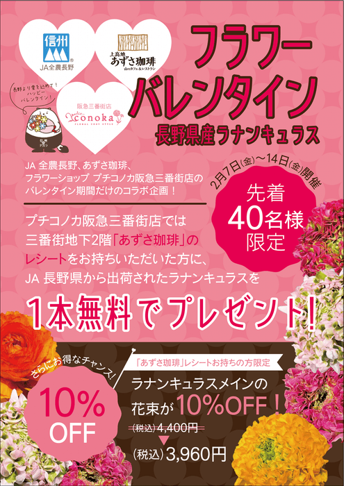 プチコノカ阪急三番街店において、阪急三番街地下2階の『上高地あずさ珈琲阪急三番街店』のレシートをお持ちいただいた方に、長野県JAから出荷されたラナンキュラス1本を先着40名様限定でプレゼント。又、期間中『上高地あずさ珈琲阪急三番街店』レシートお持ちの方限定で、ラナンキュラスの花束4,400円(税込)を10%割引でご購入頂けます。
