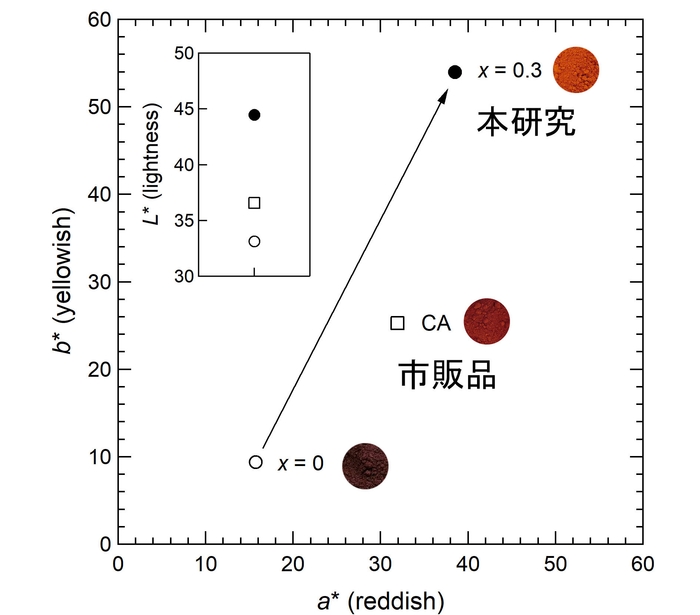 この研究では、元素置換、多孔質化、表面処理により、通常の酸化鉄の約2倍の彩度を有する高耐候性酸化鉄赤色顔料を開発しています。世界最古の抽象絵画や旧石器時代の洞窟美術の“赤”に使用された、安定で安全な酸化鉄(ヘマタイト)で高彩度を実現し究極の赤色を開発することを目指しており、1,200℃で加熱しても強粉砕しても退色しない実験結果が出ています。材料・化学関連・医療・医薬・バイオ関連などの業界で活用が見込まれます。