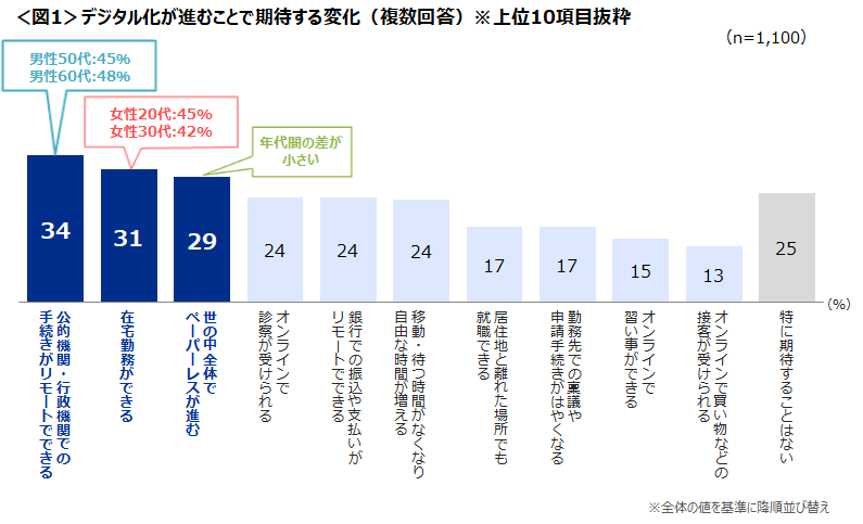デジタル化に期待する変化は、「公的機関・行政機関の手続きリモート化」「在宅勤務」「世の中全体のペーパーレス化」がTOP3。