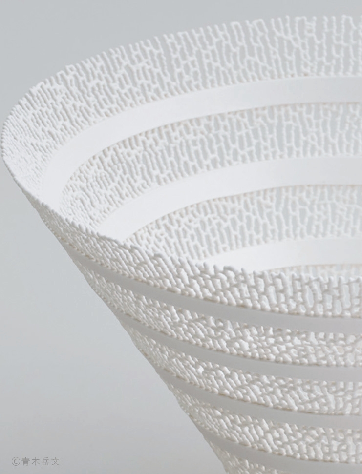 陶芸家の青木岳文は、白磁土をスポイト状の道具でごく小さな粒状に絞り出し、それらをつなぎ合わせるように積み上げ、型取りした帯状のパーツと組み合わせた造形作品を制作しています。磁土を型取りすることで生まれるまっすぐで幾何学的な面と、手で一粒一粒絞り出し積み重ねた軽やかで空気感のある面が光を受けて繊細な陰影を見せ、白く凛とした調和を生み出しています。期間中、megumu artで個展を開催しています。