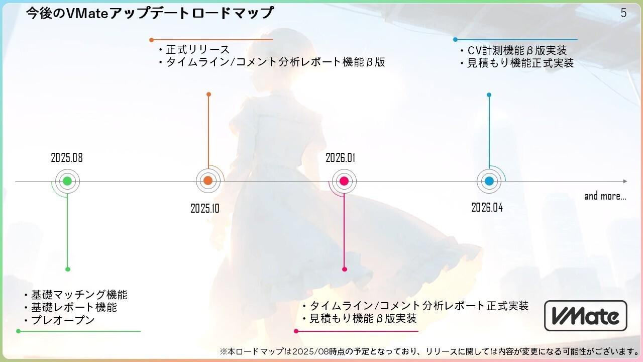 2025年10月の本リリース以降、レポート機能のアップデートを予定しております。また順次、登録VTuberの拡大や企業とVTuberのマッチング機能強化など、継続的なアップデートを進めてまいります。