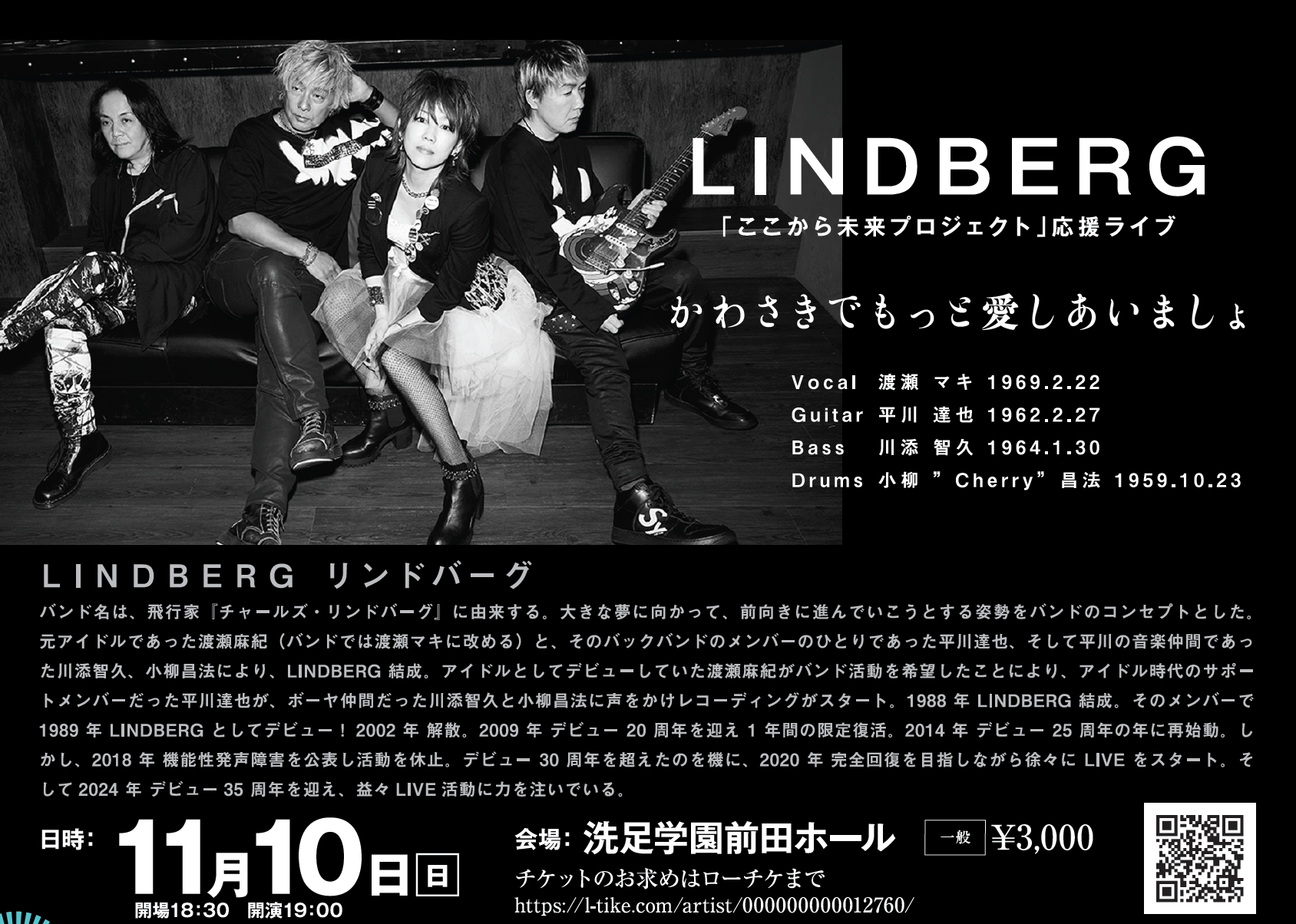 『今すぐKiss Me』で大ヒットし、今なお多くのファンを魅了し日本の音楽シーンを彩る伝説的なロックバンド【LINDBERG】が洗足学園前田ホールでのスペシャルライブに出演し、川崎市市制100周年を祝い、川崎の夜を盛り上げます!!