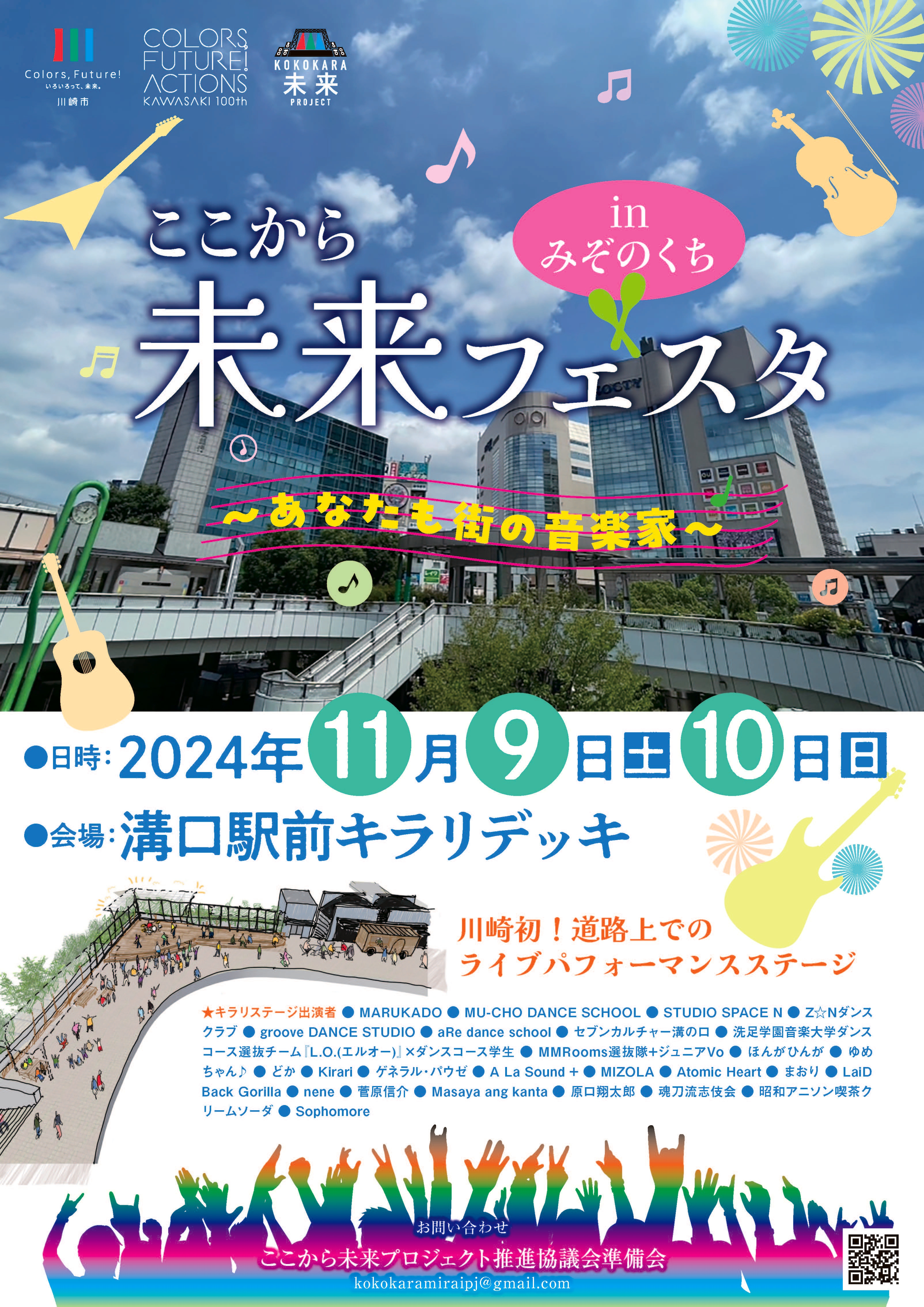 その皮切りとして、2024年11月9日(土)、10日(日)溝口駅前キラリデッキにて『ここから未来フェスタ in みぞのくち~あなたも街の音楽家~』を開催!