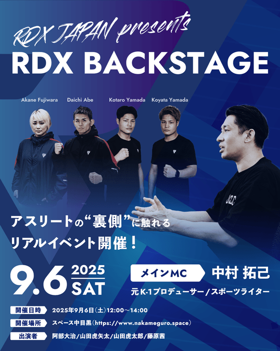 2025年9月6日(土)に中目黒「SPACE CYAN」にて初開催となる格闘技界の第一線で活躍するトップアスリートたちと、ファンが直接ふれあえる新しいスタイルのイベント『RDX BACKSTAGE』 。既に豪華出演アスリートを公表しておりましたが、この度、元K‐1プロデューサーのスポーツライター 中村拓己さんがスペシャルMCとして出演することが決定いたしました。