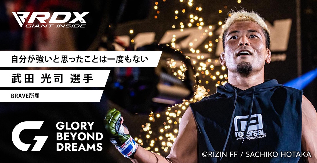 日本最高峰の格闘技団体『RIZIN』で戦う武田光司選手のインタビュー記事を独占掲載。多くの格闘技ファンを魅了しながら闘い続ける武田選手の総合格闘技との出会いや働きながら睡眠時間を削って毎日練習に取り組んでいた下積み時代等、トップファイターになるまでの知られざる軌跡を語っていただきました。詳しい内容はインタビューメディア「GLORY BEYOND DREAMS」に掲載されています。