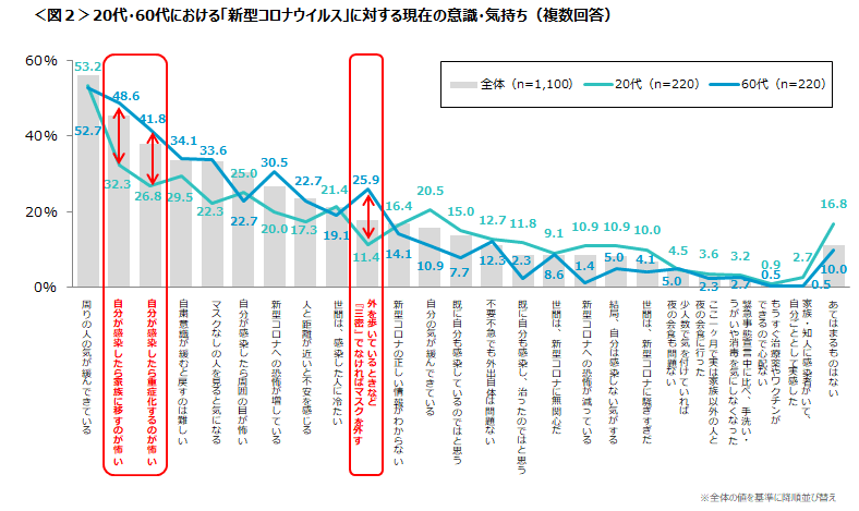 新型コロナウイルスに対する現在の意識・気持ちを年代別にみると、60代では、「自分が感染したら家族に移すのが怖い」、「自分が感染したら重症化するのが怖い」において、20代を15ポイント以上も上回っている。「外を歩いているときなど『三密』でなければマスクを外す」においても、60代では20代を14.5ポイント上回っており、新型コロナウイルスに対する年代間での意識・行動の違いがうかがえる。 <図2>