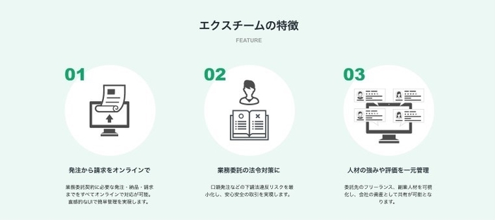 「フリーランス・副業人材の管理を安心・安全・スマートに」を実現するエクスチームは、「社員もフリーランスも、ワンチームで活躍する組織を広めていく」ことをミッションに、外部人材を活用する企業が業務委託者をリスト化し、発注から請求までを一元管理できるサービスです。