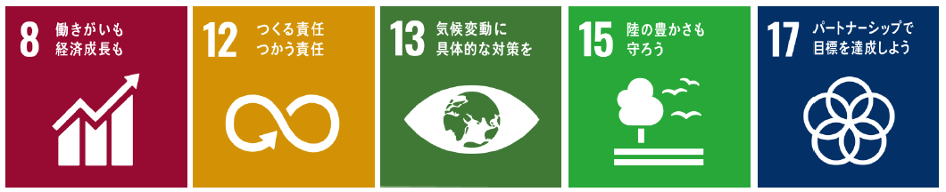 当社は「大阪産(もん)」商品の開発を通して、国連が策定した「持続可能な開発目標(SDGs)」で掲げる17のゴールのうち、目標8「働きがいも経済成長も」・目標12「つくる責任 つかう責任」・目標13「気候変動に具体的な対策を」・目標15「陸の豊かさも守ろう」・目標17「パートナーシップで目標を達成しよう」のゴールの達成に寄与します。