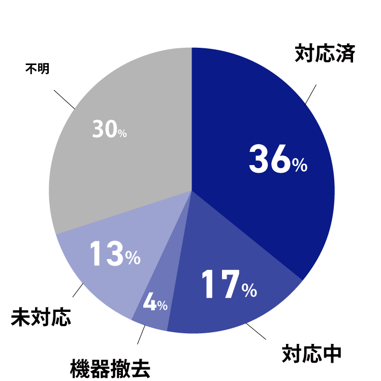 今回の注意喚起連絡時点では、12%の企業は脆弱性対応のためのバージョンアップの必要性を認識していない状態でしたが、58%の企業は必要性を認識しており、すでに対応済みか順次対応中でした。