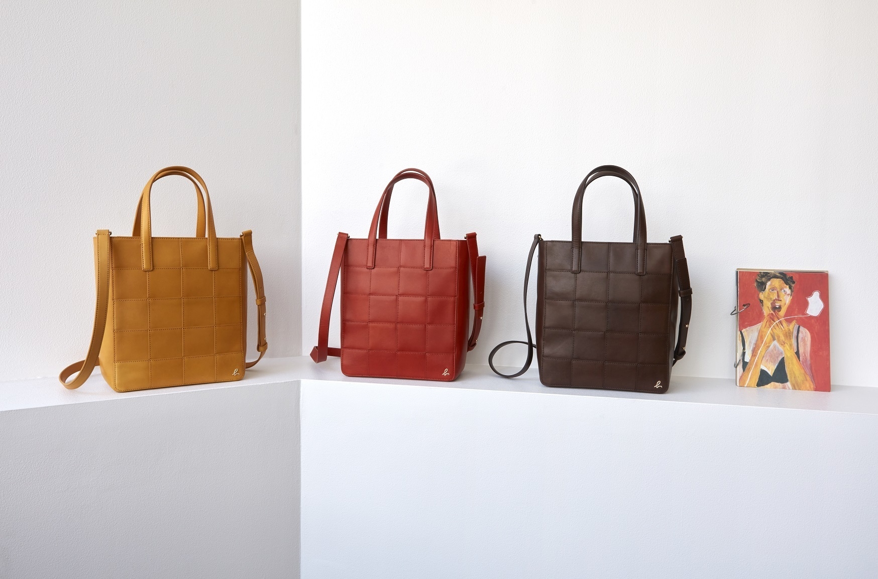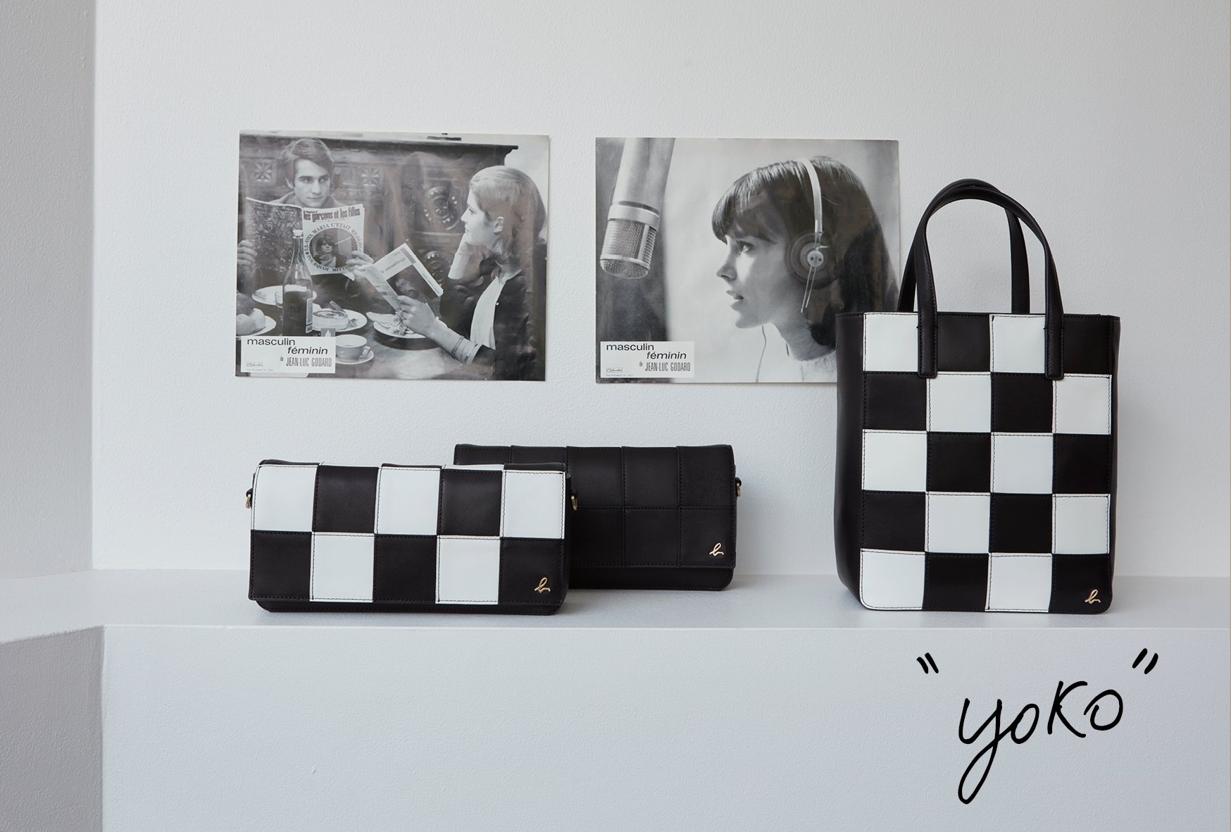 白黒のコントラストが印象的な“yoko”は、スタイリッシュなスクエア型のトートバッグとカクテルバッグの2型で登場。カクテルバッグは、アニエスベー自身がカンヌ映画祭へもっていくほどお気に入りのシェイプです。思いっきりフェミニンになりがちなスタイルに、チェックのようなパターンでアニエスベーらしいロックの要素をピリッとアクセントに効かせました。トートバッグは、秋を感じるカラーバリエーションも展開。