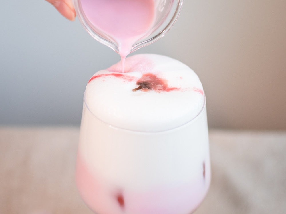 ドリンクメニューはさくら味の濃さを選ぶことができる「濃厚自家製さくらオレ」と「自家製さくらオレ」の2種類を販売いたします。自家製のさくらベースを注ぐと、綺麗な2層に仕上がり、さくらのテリーヌショコラ ~チーズクリーム~と一緒に撮ることで満開の桜スイーツを楽しむことができます。